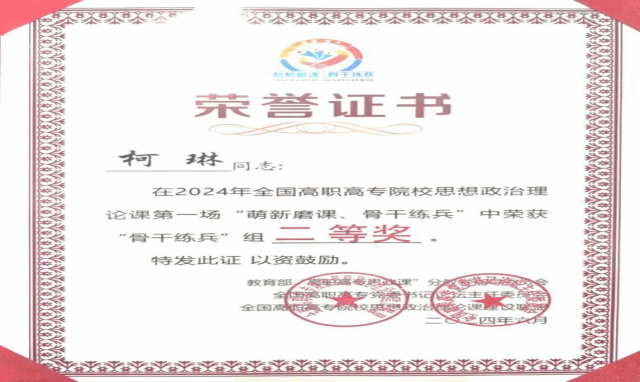 图8 2024年全国高职高专院校思想政治理论课第一场“萌新磨课、骨干练兵”获奖证书