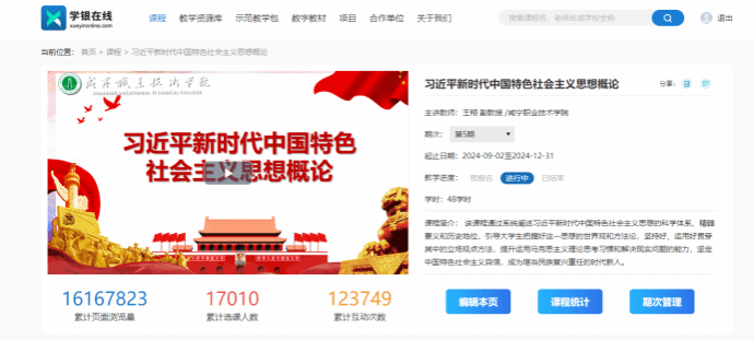 2024年度公司共开设《思想道德与法治》、《毛泽东思想和中国特色社会主义理论体系概论》、《习近平新时代中国特色社会主义思想概论》、《形势与政策》四门公共必修课在线开放课程,一门《赏学红楼梦》公共选修课在线开放课程。其中,《习近平新时代中国特色社会主义思想概论》课程累计选课人数达17009人次,累计互动次数123749人次,课程资源总数192个,授课视频总数量70个。