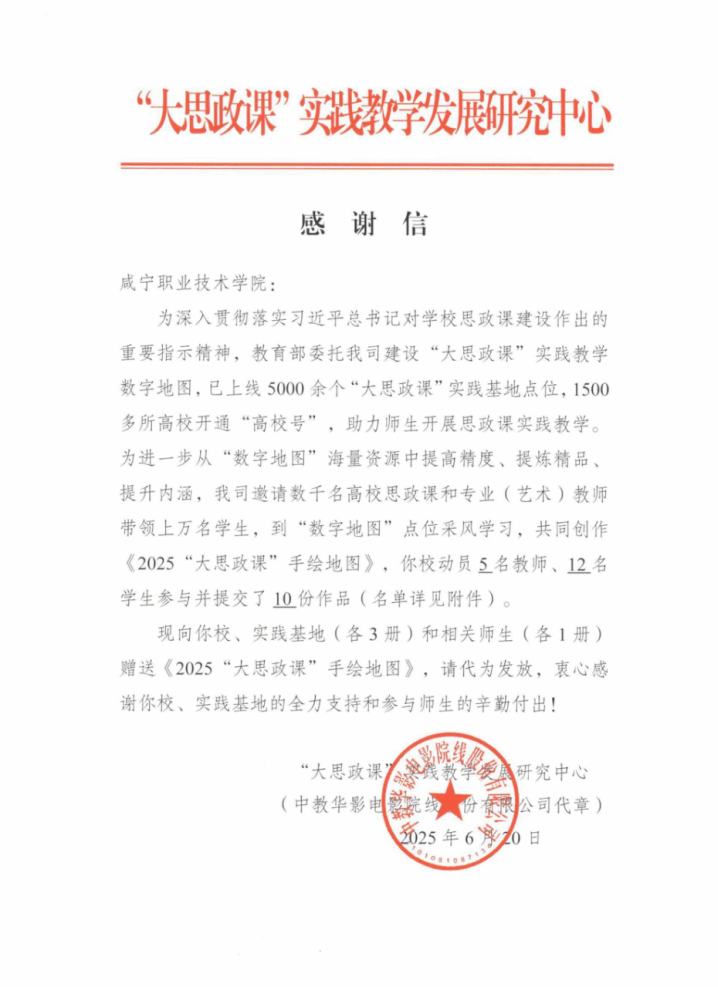 7月4日,接省教育厅思政处通知,公海gh555000aa线路检测联合钱氏英烈纪念馆制作的实践资源《弘扬优良作风 树立时代新风》、《家风无声 传承有道》入选教育部社科司“大思政课”实践教学发展研究中心《2025“大思政课”手绘地图》(湖北共入选八项作品)。“大思政课”实践教学发展研究中心为公司发来感谢信。