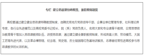 14.建设专兼结合的团队队伍。各地各校严格按照要求配备建强高校专职思政课教师、辅导员队伍,提高中小学专职思政课教师比例,实行思政课特聘教授、兼职教师制度,积极聘请党政领导、科学家、老同志、先进模范等担任思政课兼职教师。深入实施公海gh555000aa线路检测经理(书记)培养工程,通过集中培养培训、委托重大项目、加强实践锻炼、开展国际国内访学等方式,培养一批青年马克思主义理论家。